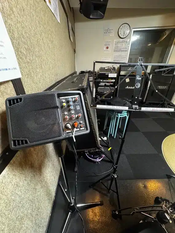 スタジオドラム横にモニタースピーカーがあり、自分の音を流せる仕様になっています。